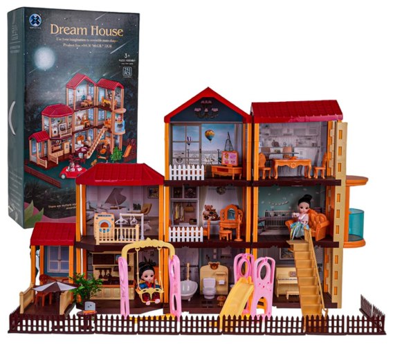 - części konstrukcyjne domku, - części konstrukcyjne płotku, - samochód, - 2 lalki, - 2 pieski, - huśtawka ogrodowa, - zjeżdżalnia ogrodowa, - parasol ogrodowy, - zestaw kuchenny z kuchenką, kranem i szafeczkami, - fortepian, - zestaw łazienkowy z ubikacją, szafeczką i rolką papieru, - wanna, - lusterko z umywalką, - stół kuchenny, - kanapa, - łóżko, - lodówka, - toaletka z lustrem, - komoda z telewizorem, - stojak na ubrania z 3 wieszakami, - pralka z otwieranymi drzwiczkami, - wieszak na ubrania, - taboret, - 2 x krzesło, - 3 x krzesło ogrodowe, - 2 x ława, - stolik okrągły, - drzewko, - 5 x lampa, - patelnia, - 2 x talerz z owocami morza, -2 x łopatka, łyżka, - instrukcja montażu. |