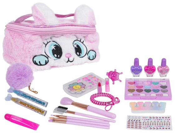 Zestaw małej stylistki w ślicznej torebce dla dzieci od trzeciego roku życia. Pluszowa torebka z kotkiem mieści w sobie takie skarby jak: lakiery do paznokci, cienie do powiek, pędzle, sztuczne paznokcie i wiele innych. Zestaw wykonano z najlepszej jakości materiałów bezpiecznych dla dzieci. Kosmetyki nie powodują uczulenia, są antyalergiczne, łatwo się je zmywa, wystarczy tylko woda z dodatkiem mydła.